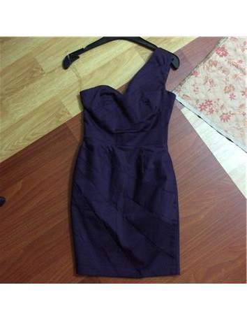 Mor, mini, sırtında gümüş fermuar detayı var, tek omuzlu elbise. Bedeni uymadığı için satıyorum sadece bir kez giyildi. Bedeni 6 (34).