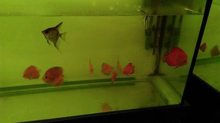 Siyah Mobilyalı akvaryum 120*50*60 8 mm cam kalınlığında buhar sürgülü dolaplı 300 w 100 w ısıtıcı uzaktan kumandalı led ışık 80 cm hava taşı çift çıkışlı hava motoru jebo 825 dış motor 30 kiloya yakın iki çeşit kum 5 aylık halen kullaniliyor 9 adet Discus balığı 4 adet kavra ve yavru alınmış melek balığı